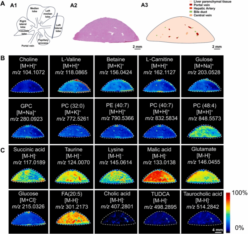 针对单一质谱成像技术难以兼顾检测覆盖度与空间分辨率的局限性问题,开展AFADESI-MSI与MALDI-MSI联用的多模态质谱成像分析方法研究。采用AFADESI-MSI无基质、广覆盖优势进行组织全域扫描,结合MALDI-MSI高空间分辨率特点对关键代谢物进行微区精准定位的分析策略,并整合组织病理学引导与LC-MS/MS结构确证,形成“广筛-精确定位-可靠注释”的完整分析流程。该方法显著提升肝脏空间代谢信息的解析精度与可解释性,并应用于糖尿病性肝损伤模型的研究,揭示葡萄糖、脂质、胆汁酸等代谢物在肝实质区、血管区及胆管区的区域特异性分布规律;评估药物干预对局部代谢异常的调控效应。该方法为复杂组织空间代谢组学研究提供新颖分析方法(Talanta , 2025, 291: 127891)。